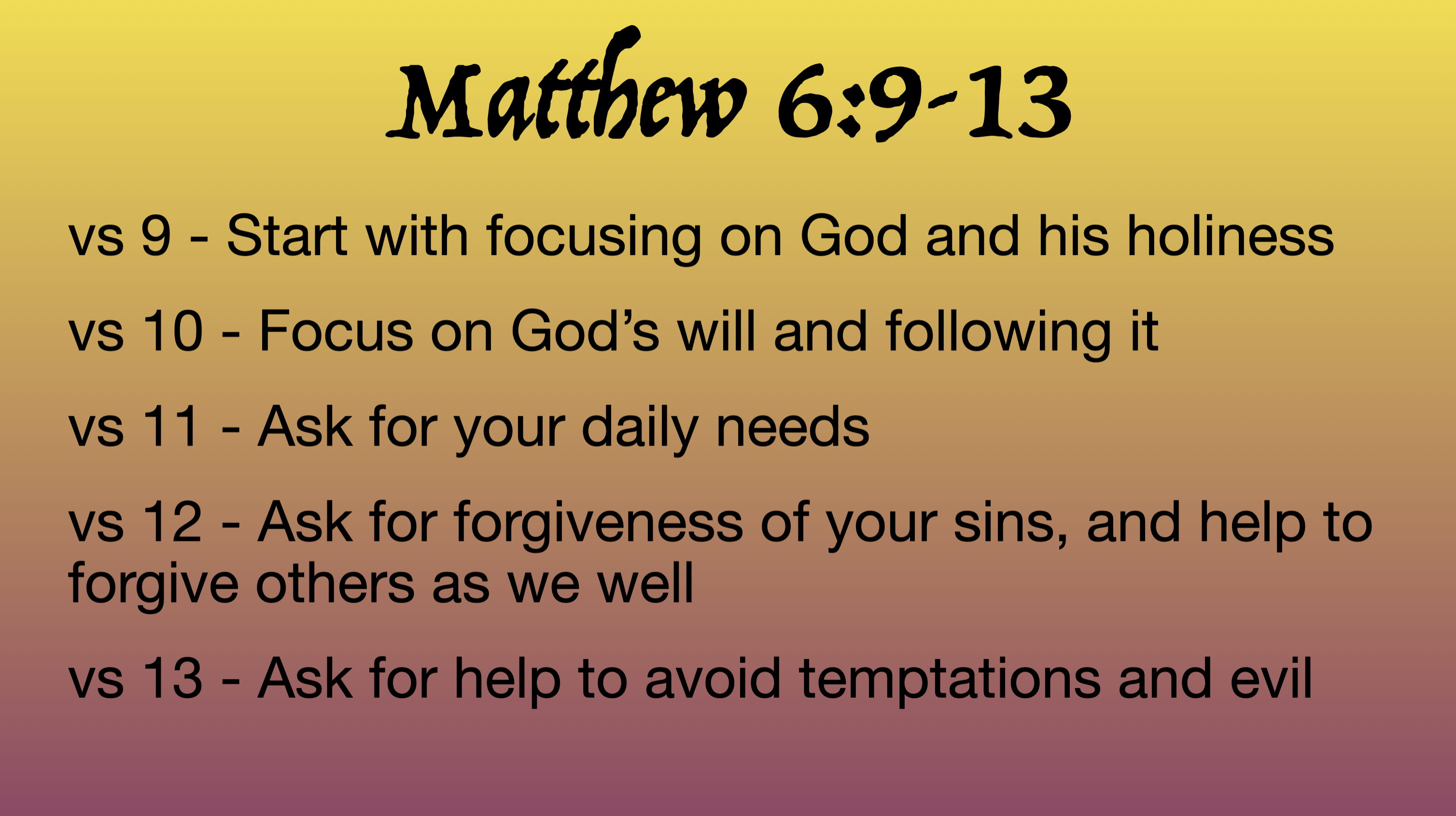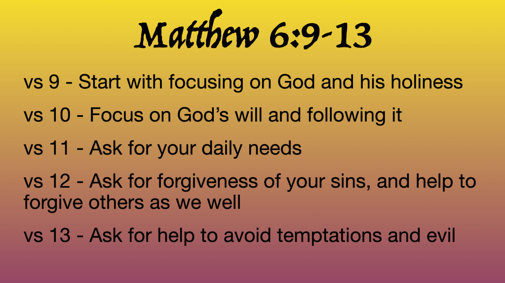 I wrapped it up by sharing that all the different examples we see, from the Lords Supper to the other one’s I found online (I will share them below), they all emphasized the importance of focusing on God; praising him, glorifying him, honoring him, and thanking him. In fact, that came before asking him for anything.